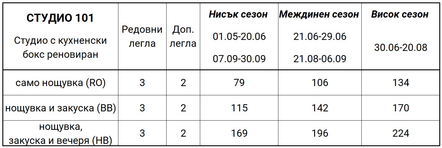 Цени на помещение на ден / HB: нощувка, закуска, вечеря, комплект чадър и два шезлонга на плажа, ползване на външен басейн, чадър и шезлонг до басейна, безжичен интернет, ползване на външен паркинг в близост до хотела, курортна такса, хотелска застраховка и 9% ДДС.